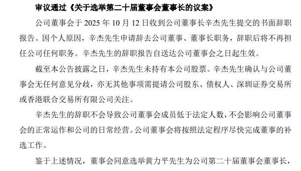 10月13日,万科企业在港交所公告,于10月12日收到公司董事长辛杰提交的书面辞职报告。辛杰因个人原因申请辞任公司非执行董事及董事长职务,辞任后将不再担任公司任何职务。第二十届董事会第二十四次会议选举黄力平担任董事长,任期自董事会审议通过之日起至本公司第二十届董事会任期届满之日止。